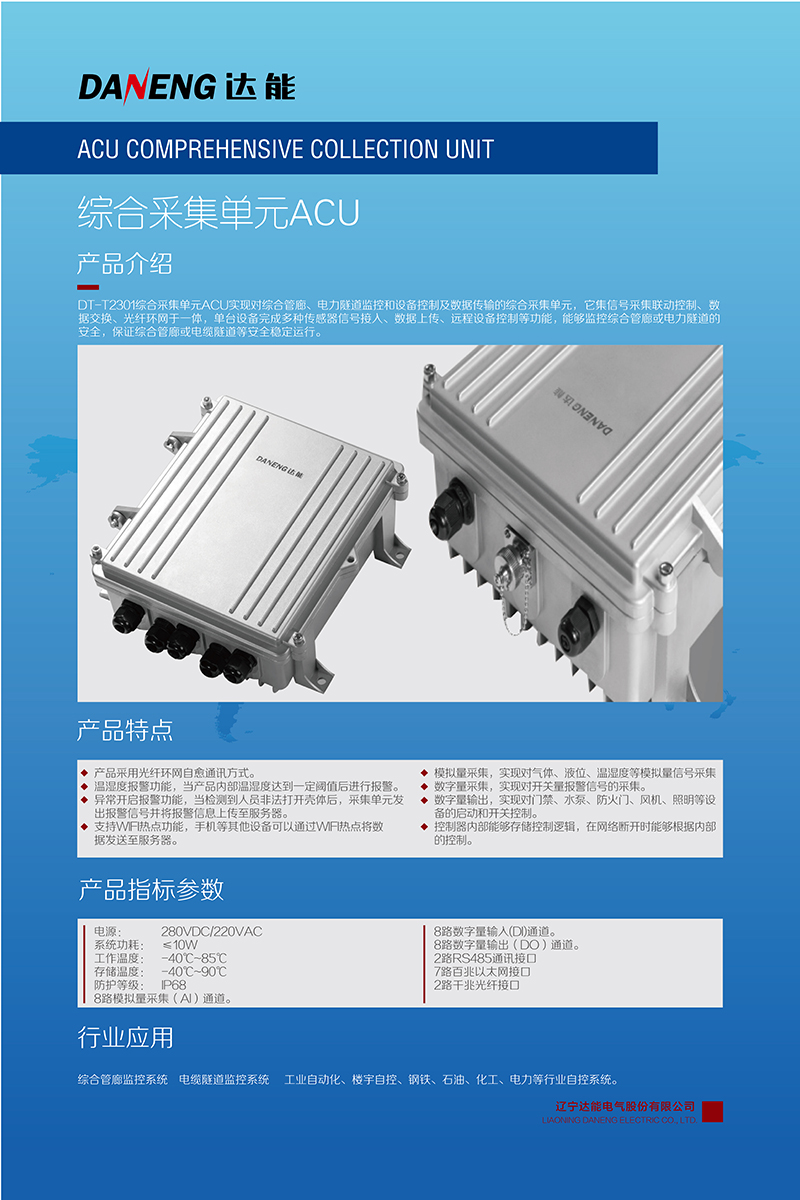 城市综合管廊或电力隧道的安全稳定运行,离不开综合监控系统,而数据采集单元是监控系统的重要组成部分。galaxy银河电气自主研发生产的DT-T2301综合采集单元ACU实现对综合管廊、电力隧道监控和设备控制及数据传输的综合采集单元,它集信号采集、联动控制、数据交换、光纤环网于一体,单台设备完成多种传感器信号接入、数据上传、远程设备控制等功能,能够监控综合管廊或电力隧道的安全,保证综合管廊或电缆隧道等安全稳定运行。
