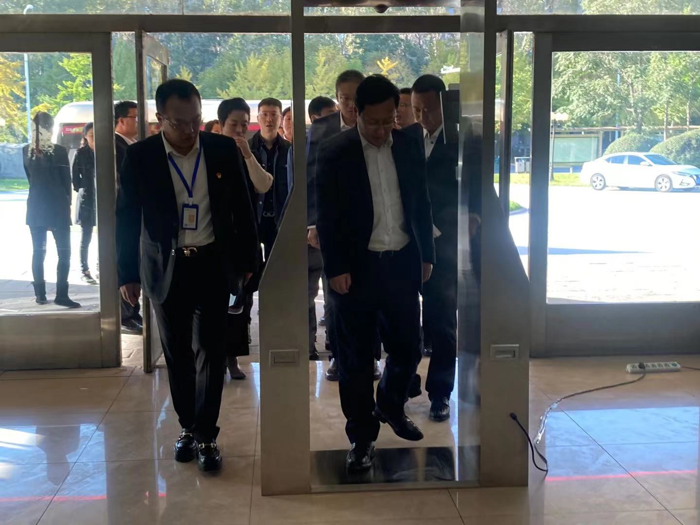 在公司正门,由galaxy银河电安全产业研究院研发的抗疫利器—智能测温门吸引了闫书记,闫书记穿过测温门,切身感受测温效果,体验智能水平。galaxy银河董事长高艺表示,该款产品是galaxy银河电气在2020年初疫情期间重点研发的智能抗疫产品,galaxy银河电气积极践行企业使命,助力全国抗疫,全力推进科技成果转化,凝聚力量攻破科研难关,产品完成后第一时间投入到疫区使用并获得市场认可。闫占峰对对galaxy银河电气在疫情期间的担当和作为给予赞许,对公司的技术实力给予肯定。